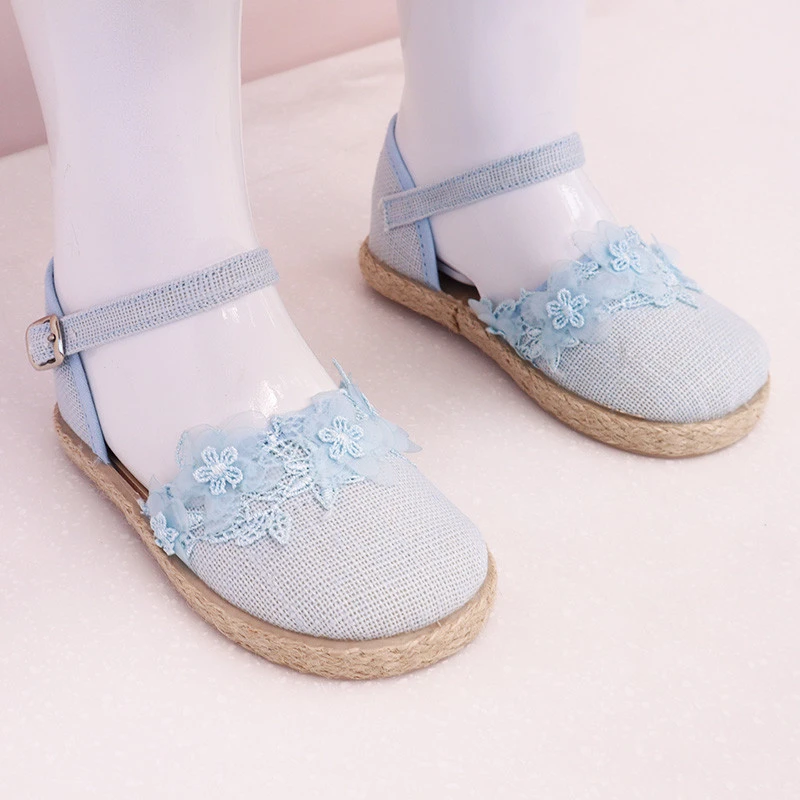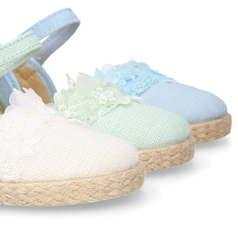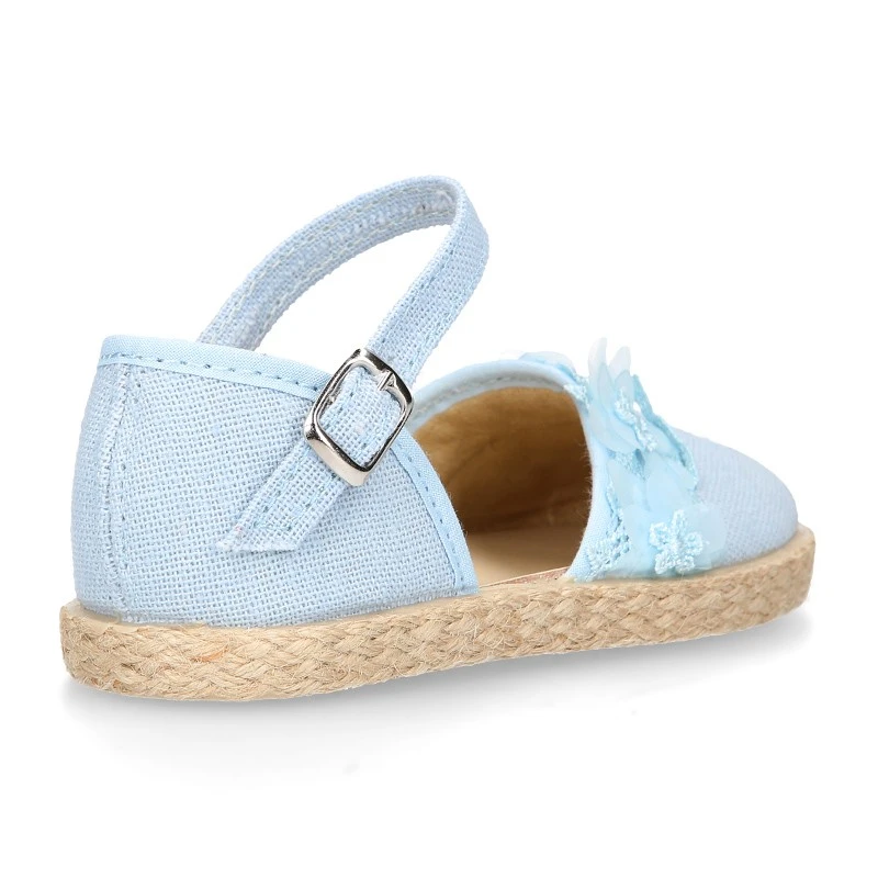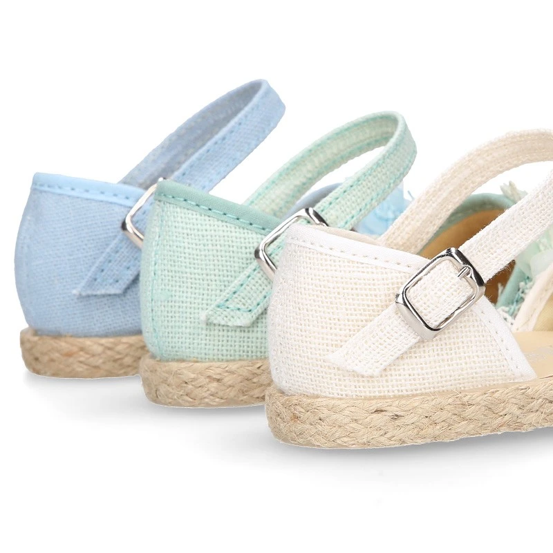 Alpargata de lona lino para ARRAS con diseño con flores, cierre con hebilla y suela SUPER FLEXIBLE para niñas. Con cierre de hebilla para una mayor comodidad y una perfecta adaptabilidad. Lona natural 100% lino de primera calidad, con certificado MADE IN GREEN en colores muy dulces. Muy elegantes, diferentes y combinan con toda su ropa esta primavera verano en el día a día o para ocasiones especiales. Es un modelo especial para combinar con los looks más especiales en CEREMONIAS y ARRAS.