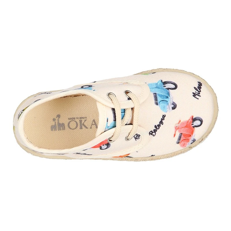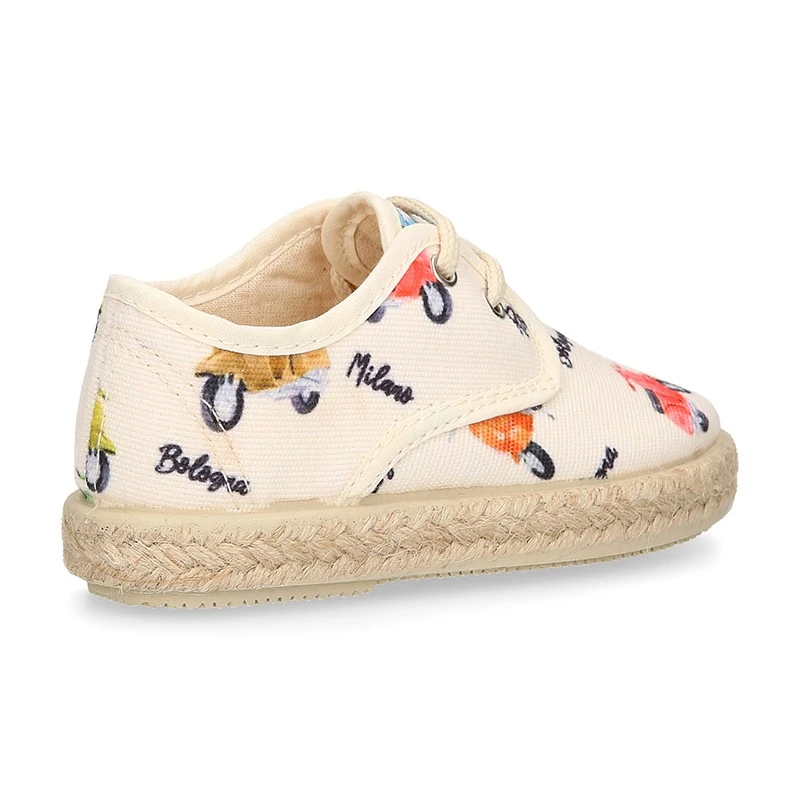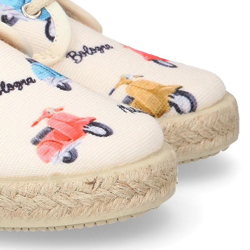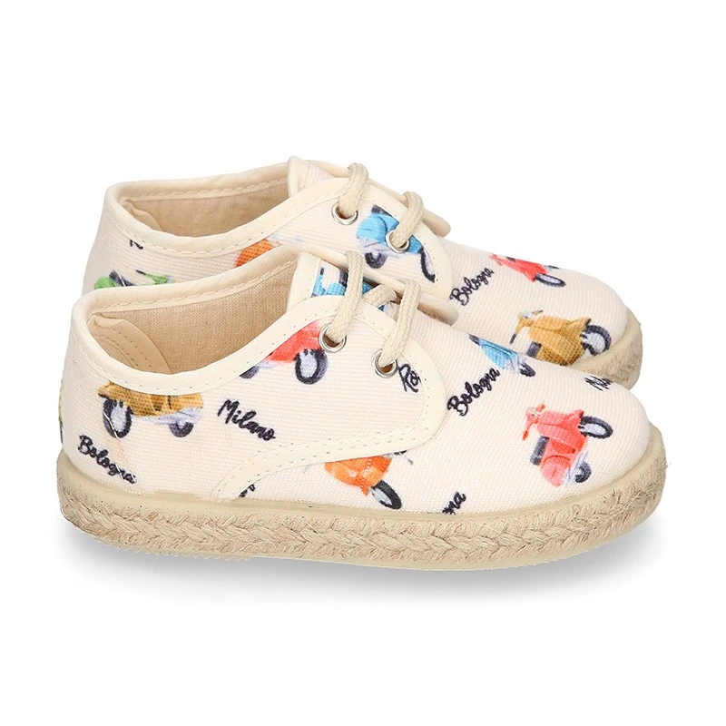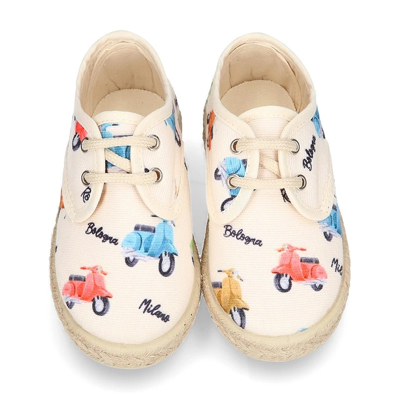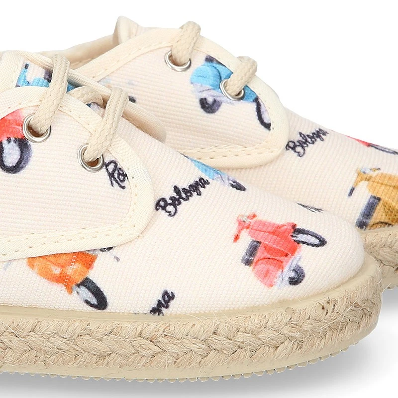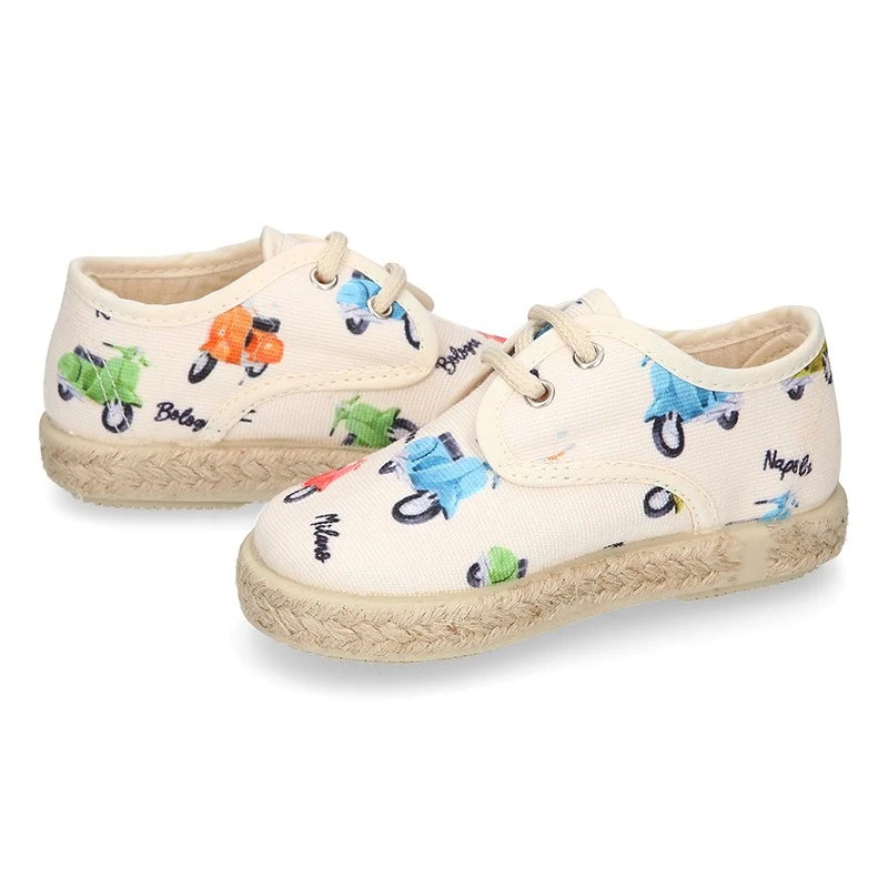 Zapato o Alpargata tipo Blucher con cordones en lona algodón con diseño con estampado con MOTOS para niños. Con cierre con cordones para una mayor comodidad, una mejor vestibilidad y una perfecta sujeción. Realizados en 100% lona algodón natural de primera calidad con diseño muy divertido con MOTOS. Un diseño muy novedoso y muy divertido para combinar con todos sus looks de este verano. Los zapatos tipo alpargatas están muy de moda esta temporada. Son un básico totalmente renovado y totalmente actualizado para esta primavera-verano. Combinan con toda su ropa para el día a día. EDICIÓN LIMITADA.