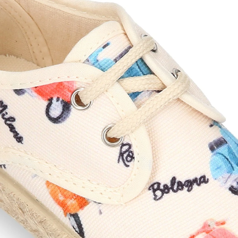 Ficha técnica de Alpargata niño tipo Blucher con cordones en lona con estampado MOTOS.
