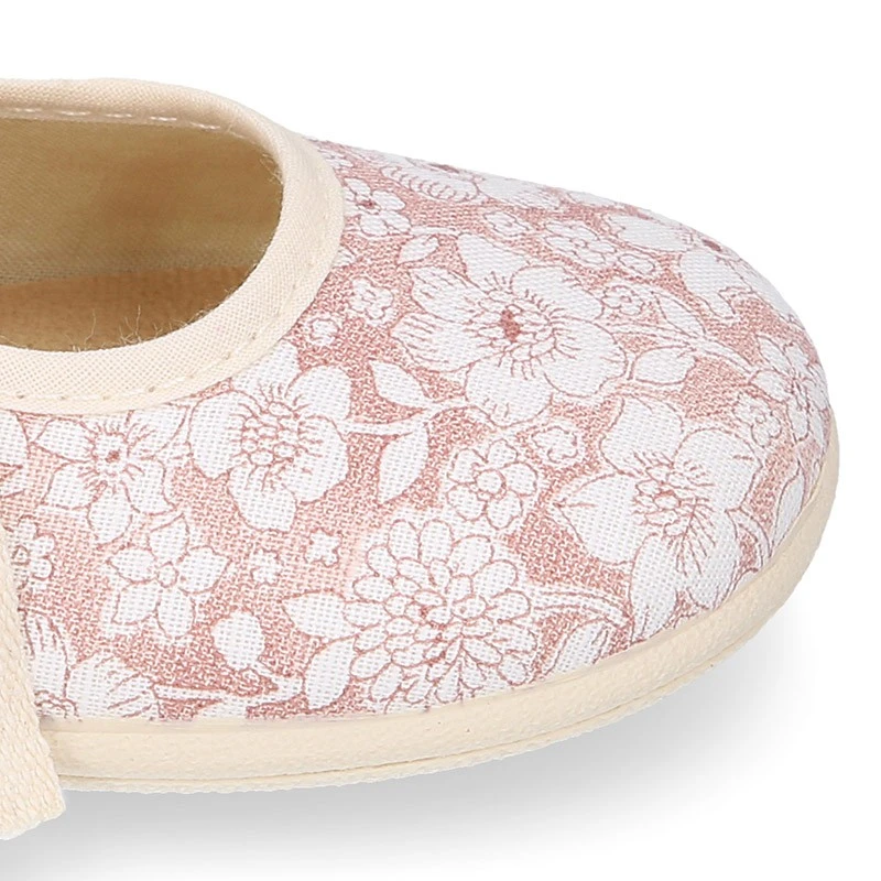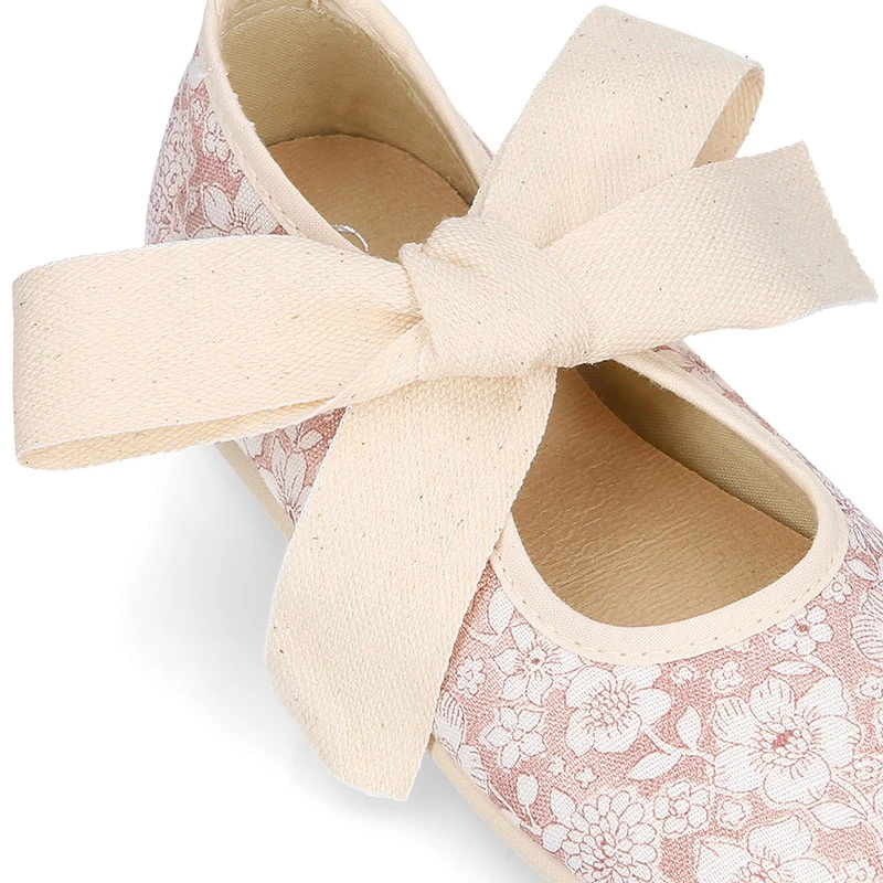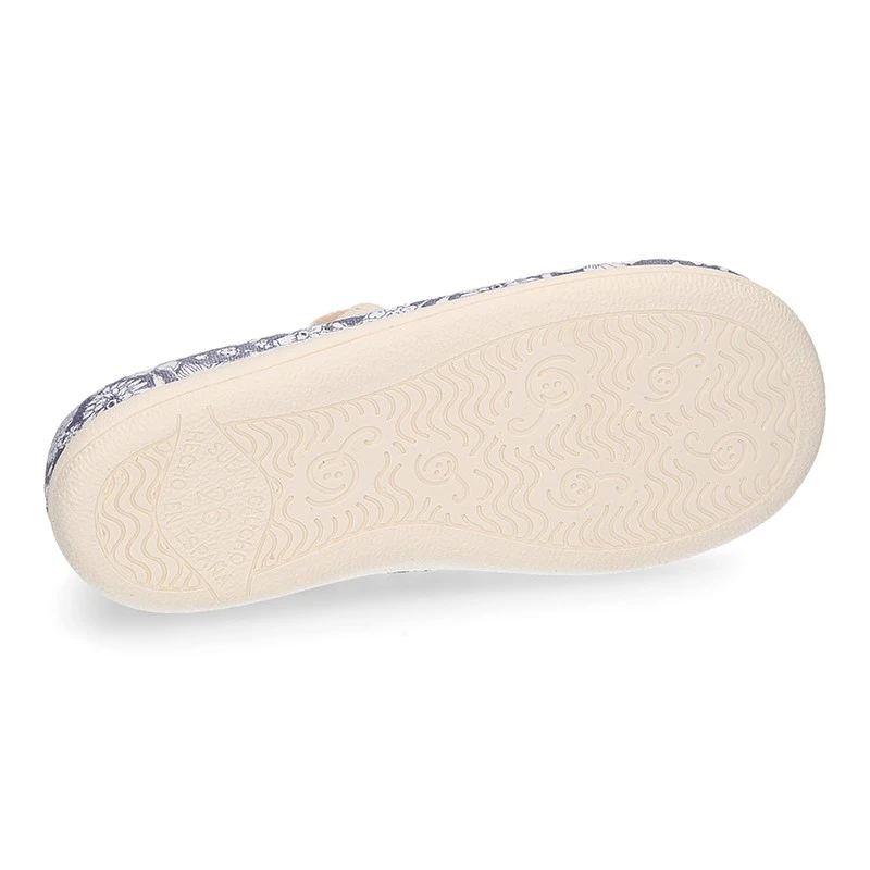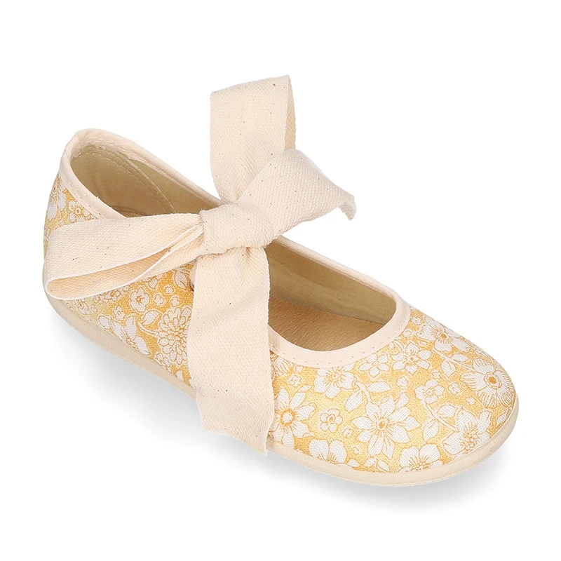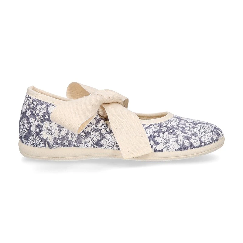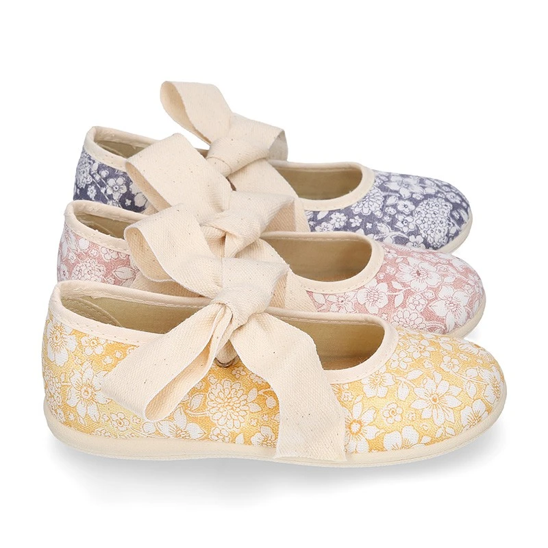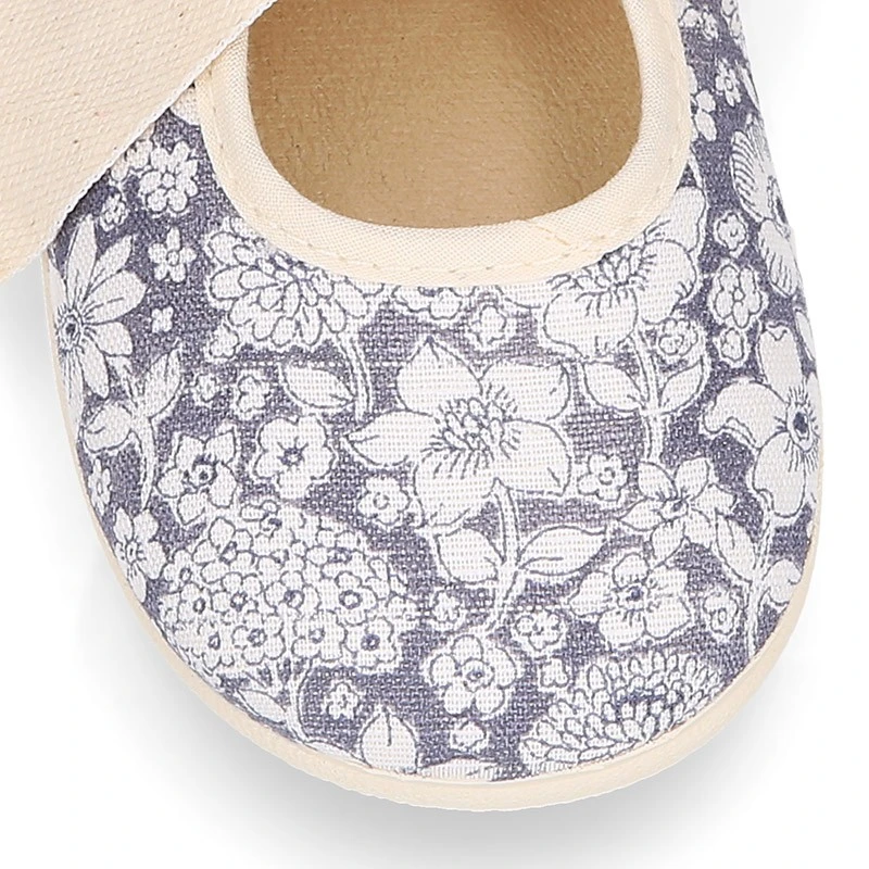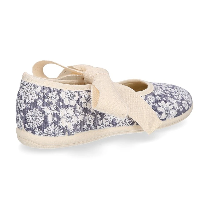 Mercedita niña tipo angelito con cierre con lazo grande en lona algodón con FLORES. Con cierre con lazo grande para una mayor comodidad, vestibilidad y una perfecta sujeción. Realizadas en 100% lona algodón natural de primera calidad con estampado floral. Los diseño con motivos florales están muy de moda esta temporada en todas las colecciones infantiles. Son un básico totalmente renovado y actualizado para esta primavera-verano de las clásicas merceditas. Combinan con toda su ropa del día a día o también para ocasiones especiales porque son muy elegantes. Son un modelo muy dulce en colores de plena tendencia para esta primavera-verano.