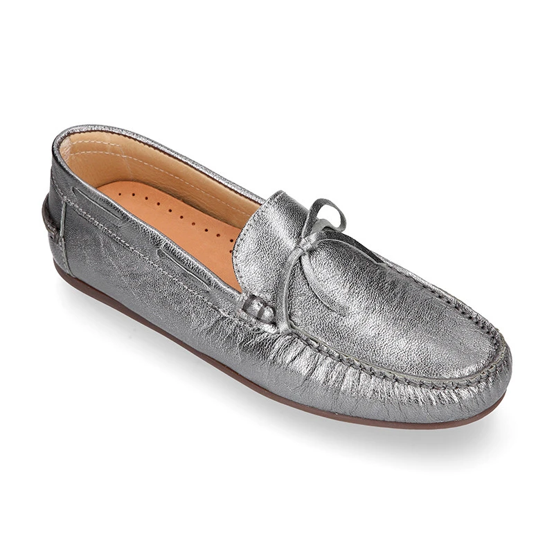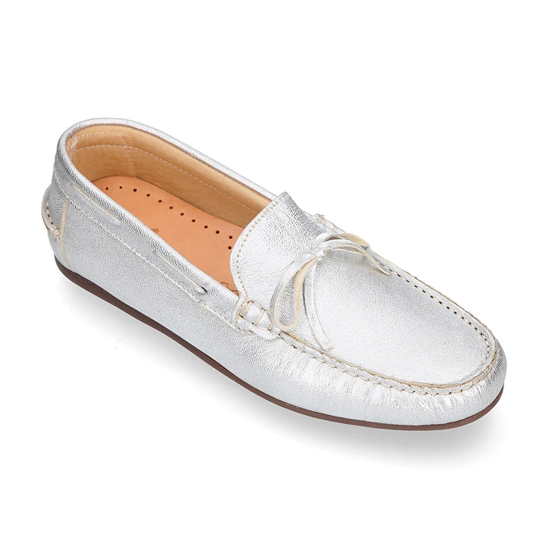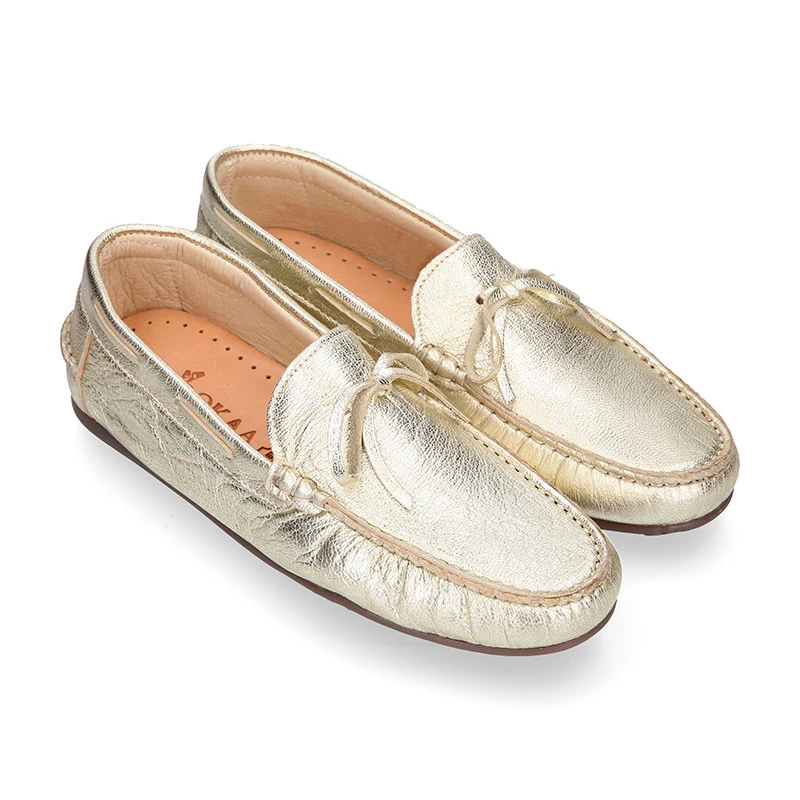 Zapato Mocasín con lazos y suela tipo conductor en piel napa metalizada para niños mayores y mamás también. Realizado en piel natural napa de primera calidad con acabado metalizado. Perfectos para un look sport o para vestir. En colores muy combinables con toda su ropa esta primavra-verano. Son muy cómodos y confortables. Los metalizados están muy de moda esta temporada en todas las colecciones. Combinan perfectos con unos vaqueros para el día a día.