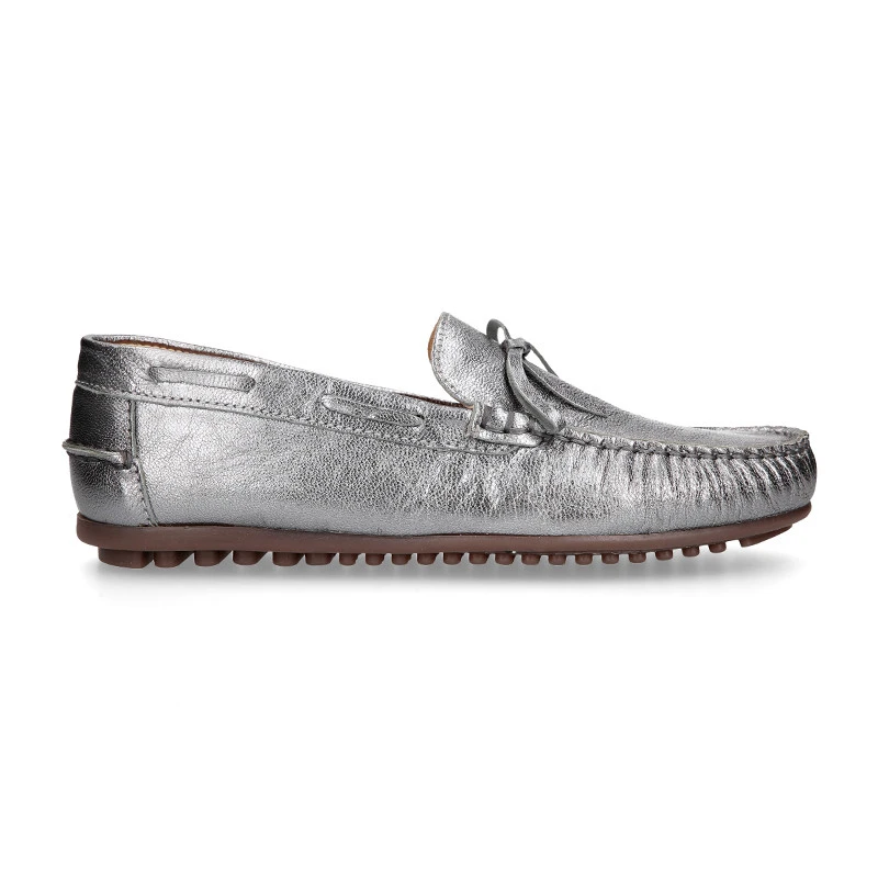 Mocasín con lazos en piel metalizada y piso conductor para mayores. TALLAN AMPLIOS.