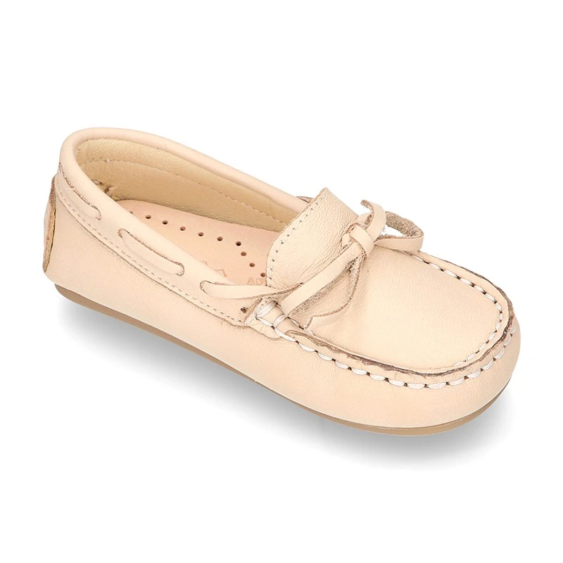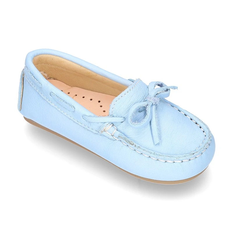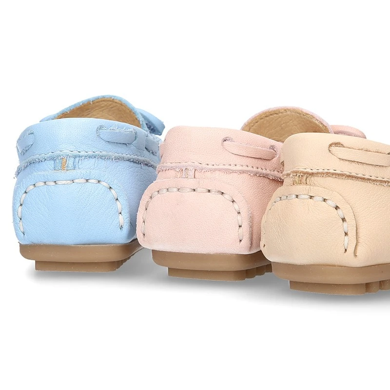 Nuevo Zapato Mocasín para peques con lazos y suela tipo conductor en piel napa EXTRA SUAVE en colores pasteles para niños y niñas pequeños. Realizado en piel natural napa de primera calidad con acabado muy suave y blandito y realizado en colores pasteles. Perfectos para sport o para vestir esta temporada. En colores pasteles muy combinables con toda su ropa esta primavera-verano. Son muy cómodos y confortables. Son un modelo muy dulce.