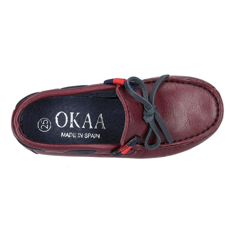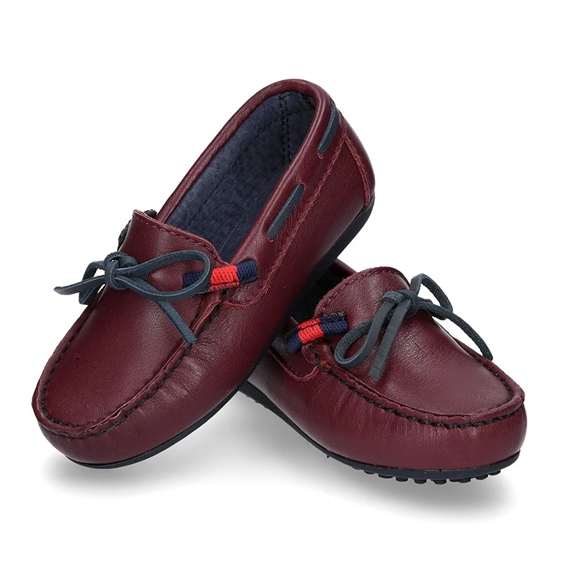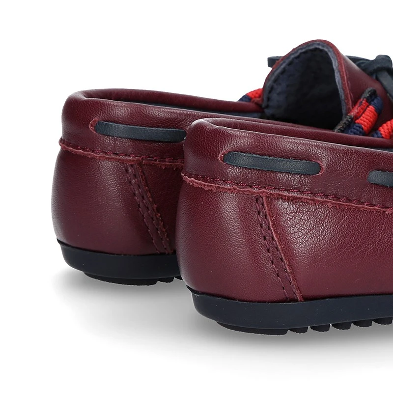 Zapato Mocasín estilo NÁUTICO con lazos y diseño con bandera lateral con piso conductor en piel napa en color burdeos para niños mayores y papás. Realizado en 100% piel natural napa de primera calidad, súper suave y en color burdeos. Es una piel muy suave y de muy buena calidad y perfecta para un SPORT muy elegante. Con diseño lateral con bandera que le confiere un aspecto más náutico y veraniego. Perfectos para un vestir casual o para ocasiones especiales esta primavera-verano. Son muy elegantes y combinan con cualquier look esta temporada.