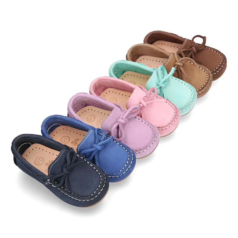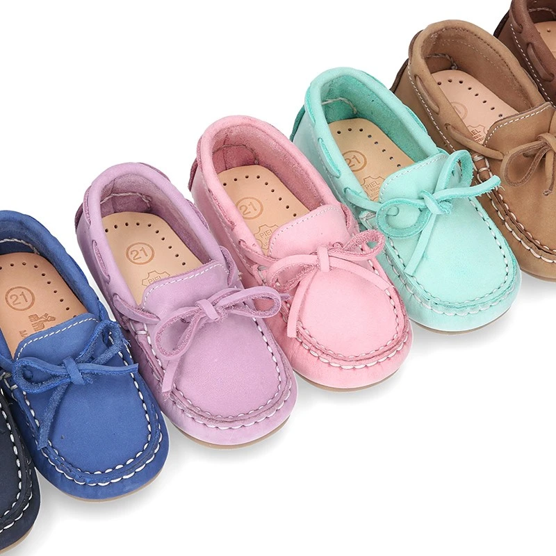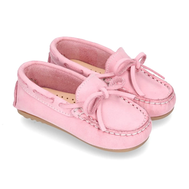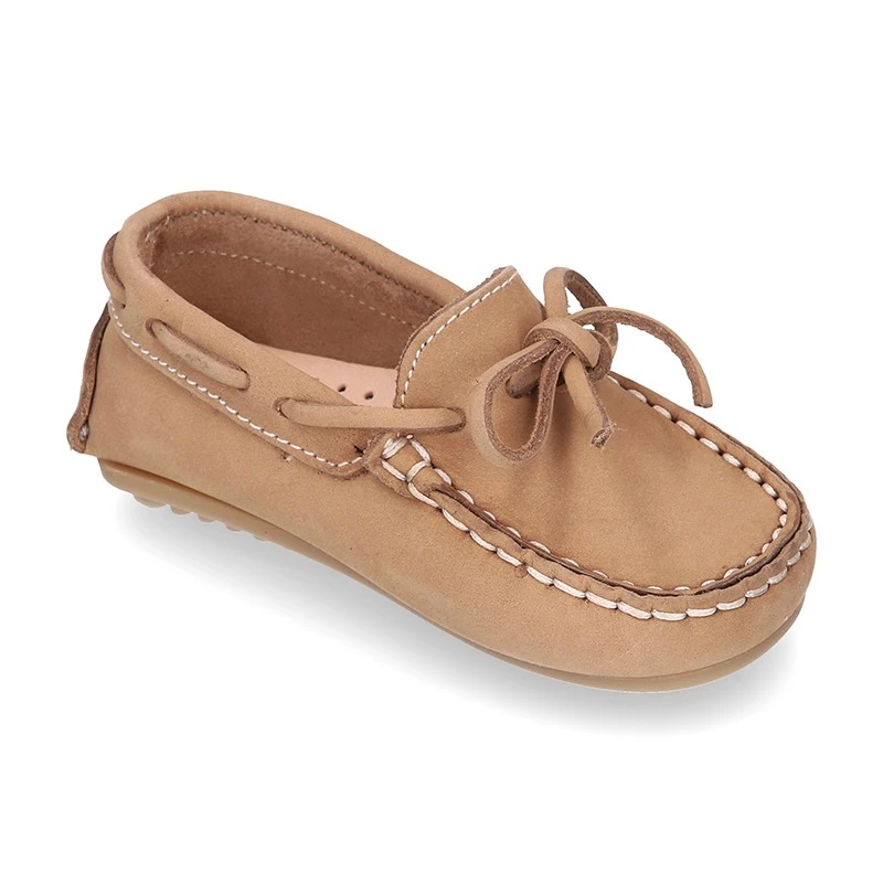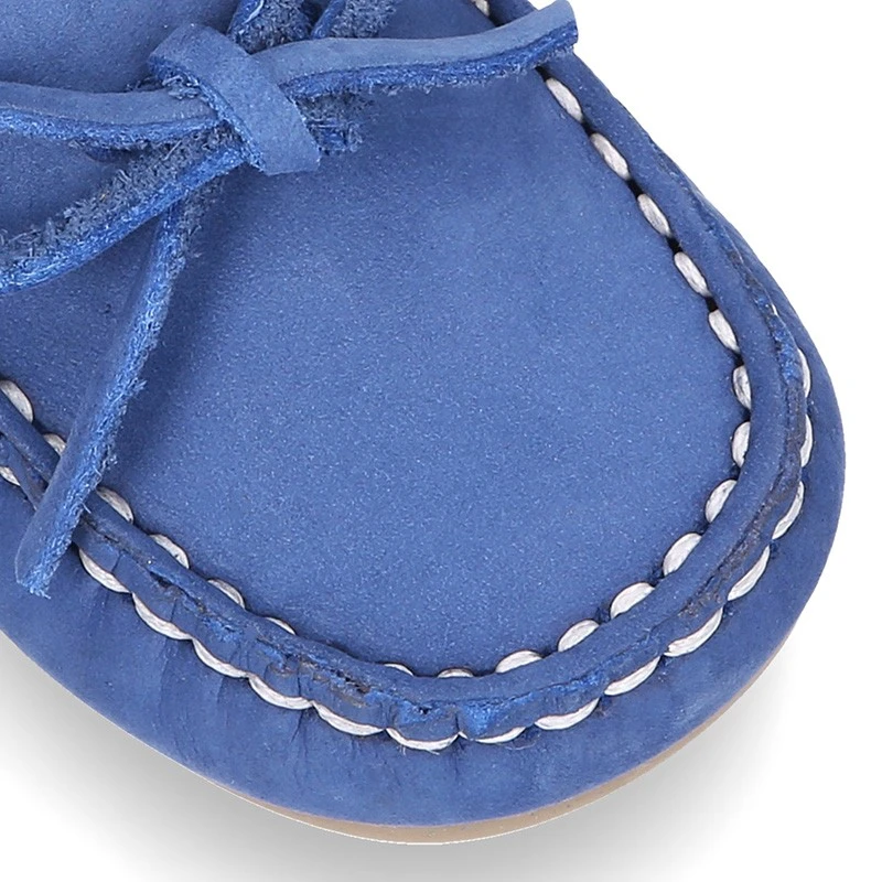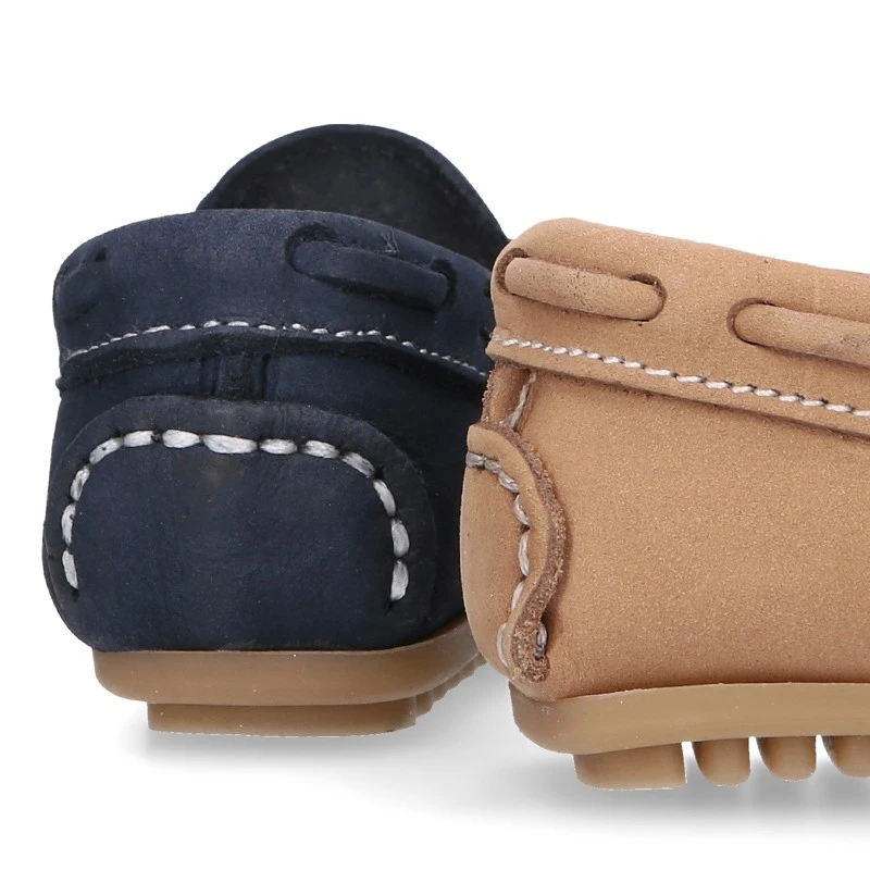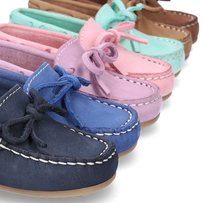 Zapato Mocasín con lazos en piel Nobuck para los más pequeños. Realizado en 100% piel natural Nobuck de primera calidad. Perfectos para sport o para vestir esta primavera-verano. Cómodos, confortables y en colores que combinan con toda su ropa esta temporada.