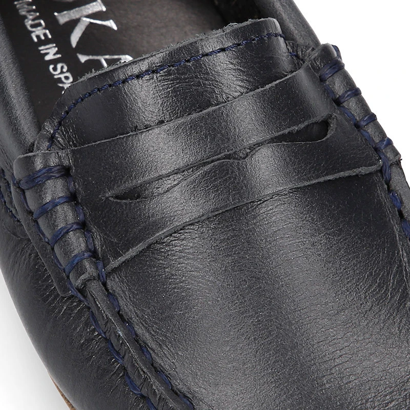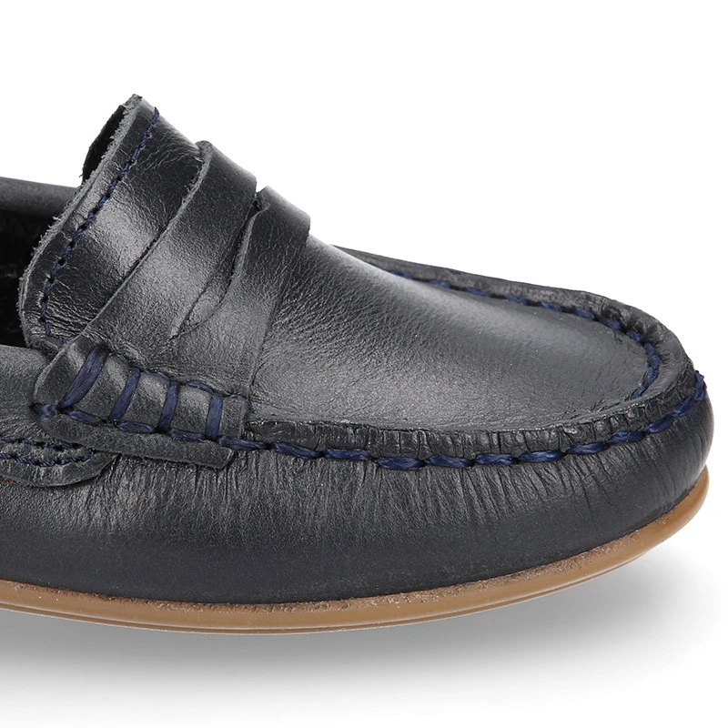 Nuevo Zapato Mocasín clásico con diseño con antifaz en piel napa suave en color azul marino para niños. Realizado en 100% piel natural suave trabajada de primera calidad y en colores clásicos como el cuero y el azul marino. Perfectos para sport casual o para vestir muy elegante y cómodo en cualquier ocasión especial esta Primavera-Verano. Son un modelo clásico de mocasín con diseño con antifaz pero con un nivel de calidad muy elevado para ser un básico y de fondo de armario para los niños cada temporada.