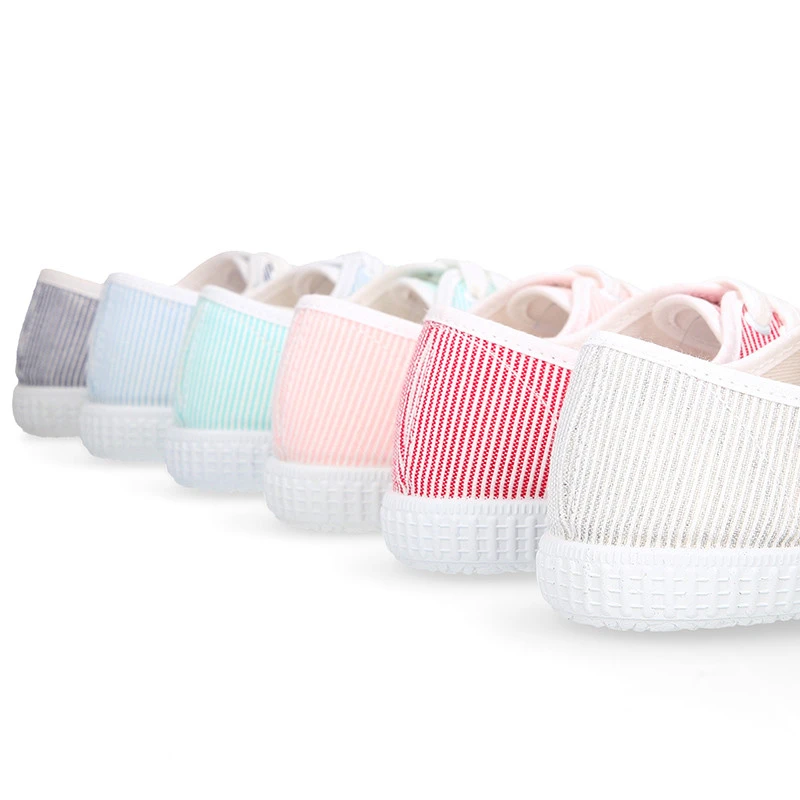 Zapatilla tipo bamba en lona de rayas con cordones para niñas y niños. Realizada en lona 100% algodón natural y acabados de primera calidad. Perfectas para el día a día porque combinan con cualquier look. Muy cómodas y confortables. Es un modelo diferente, muy dulce y combinable con toda su ropa esta primavera-verano. Son un clásico de toda la vida totalmente renovado y actualizado.