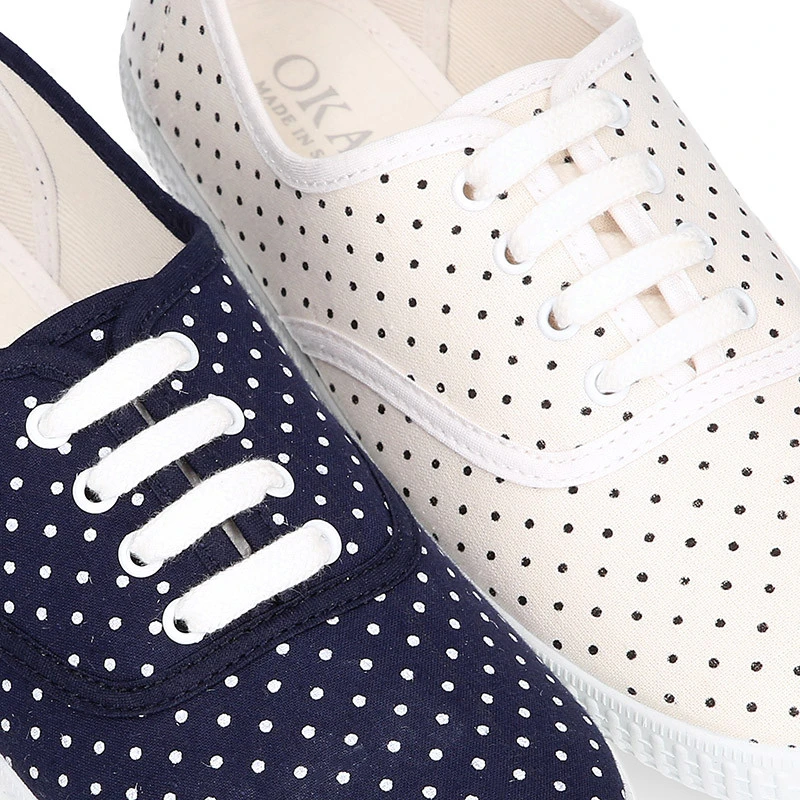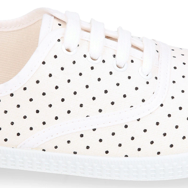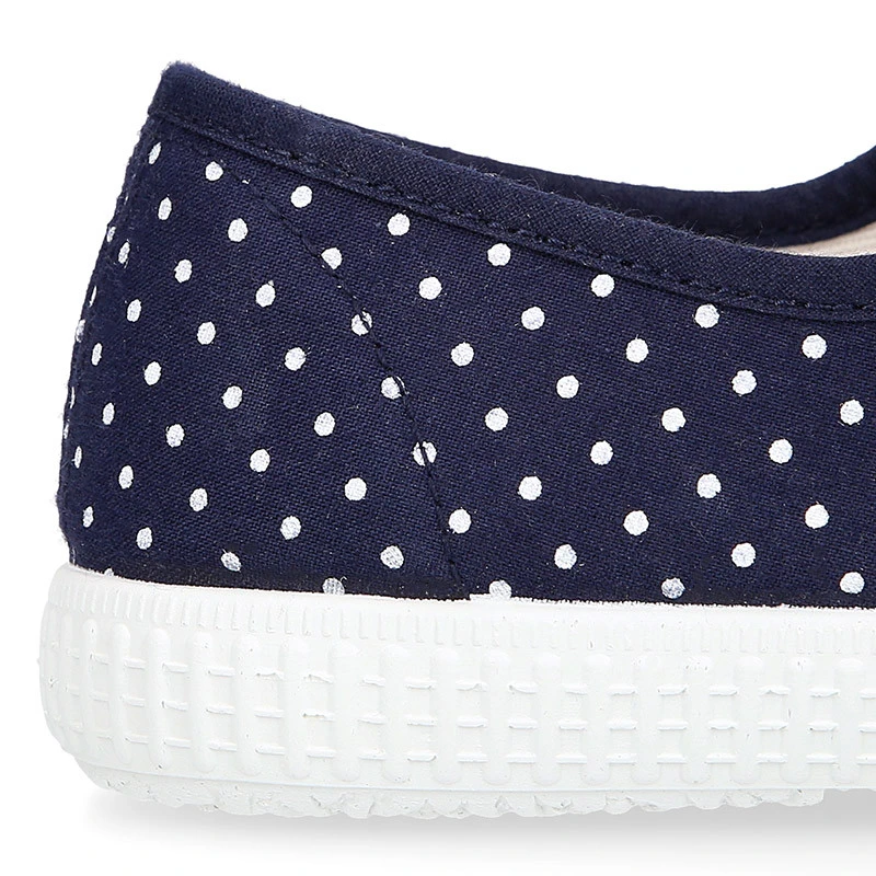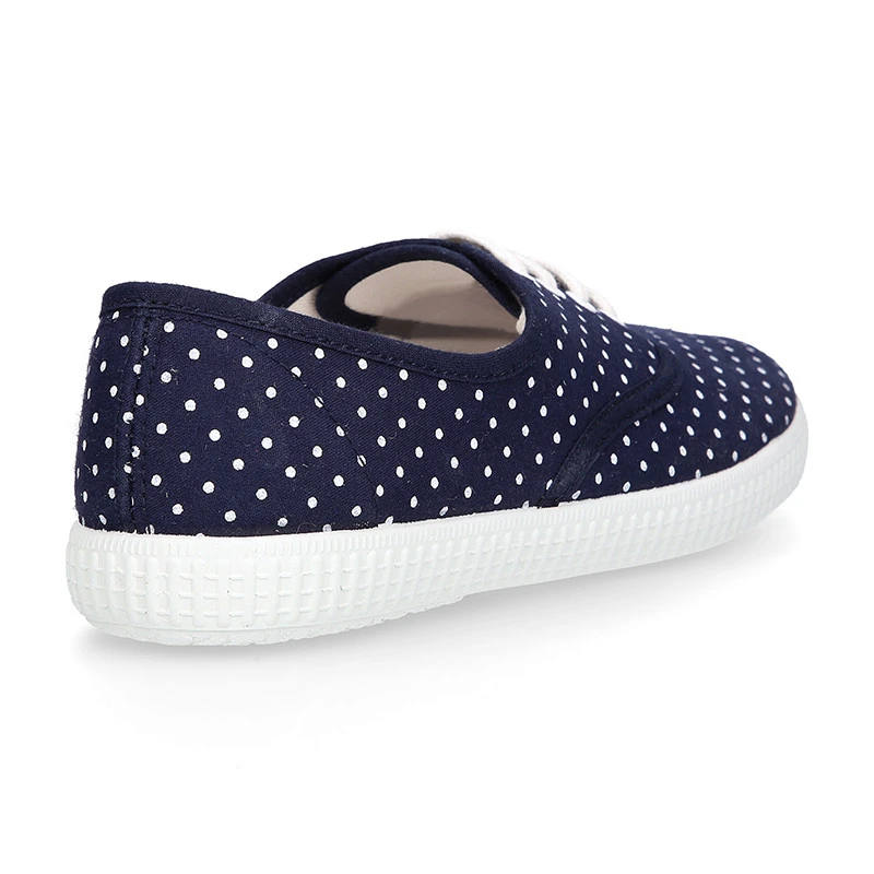 Zapatilla tipo bamba con cordones en lona con estampado de lunares para niñas y niños. Realizada en lona 100% algodón natural y acabados de primera calidad. Perfectas para el día a día porque combinan con cualquier look esta temporada. Muy cómodas y confortables. Es un modelo diferente, muy dulce y combinable con toda su ropa esta primavera-verano. Son un clásico de toda la vida totalmente renovado y actualizado.