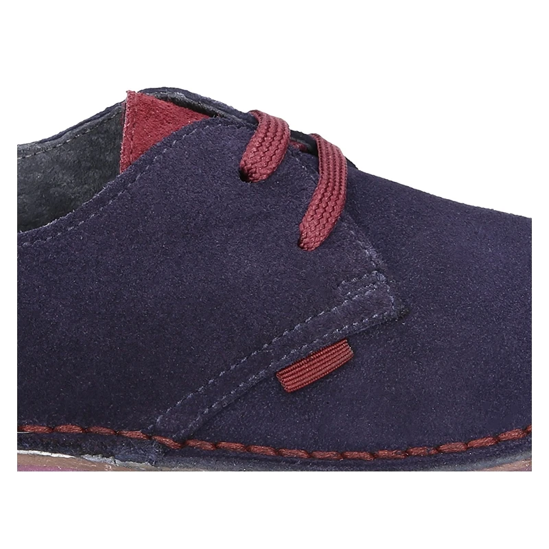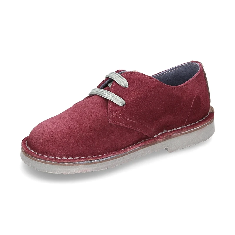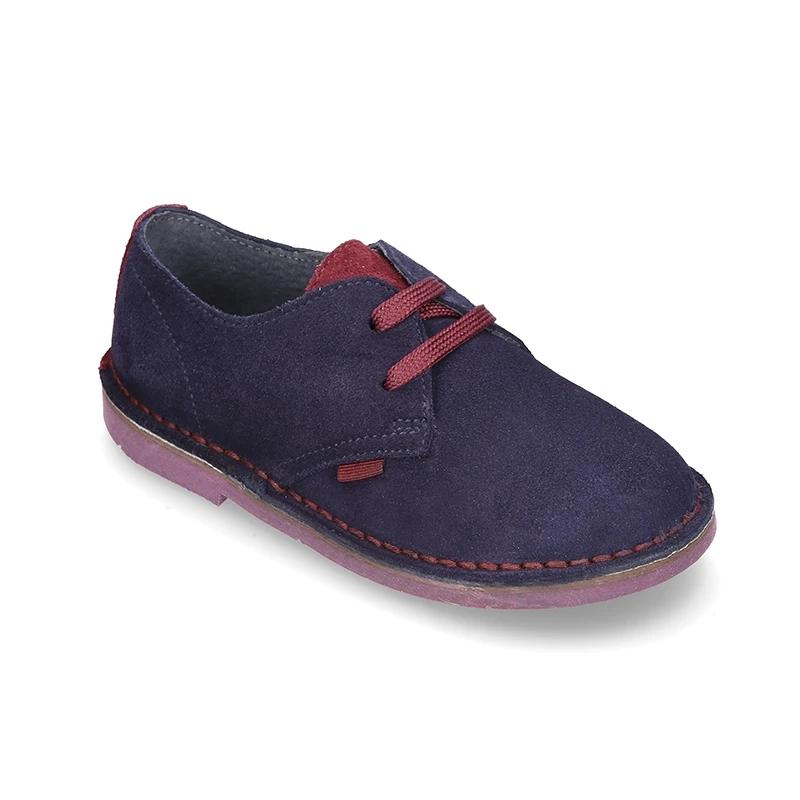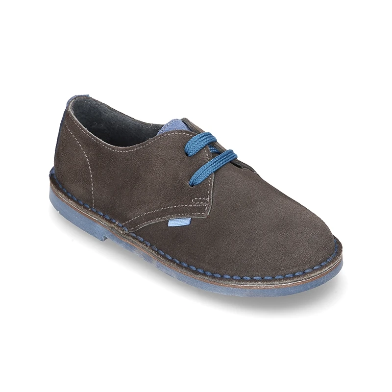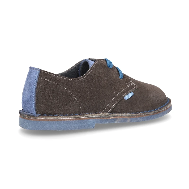 Zapatito tipo Blucher para vestir con lengüeta, cordones y suela combinada en piel serraje.