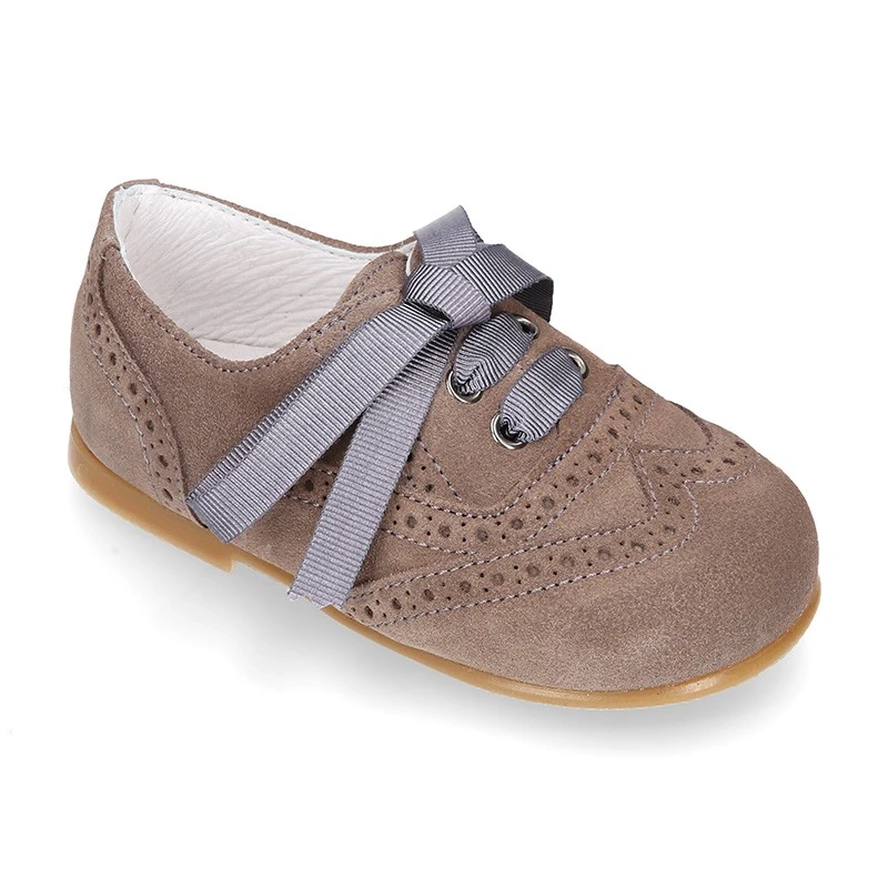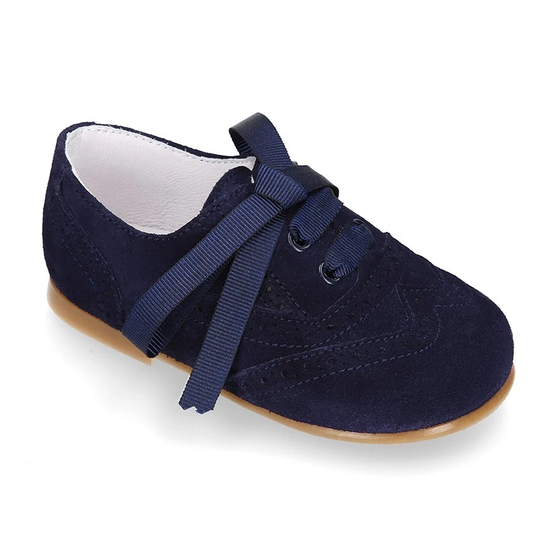 Zapatito clásico tipo Blucher con cordones con lazo de grosgrain y picados en piel serraje para niños y niñas pequeñas. Realizado en 100% piel serraje natural de primera calidad. Es un modelo muy elegante para vestir con cualquier look este otoño-invierno. Forrados totalmente en piel, con plantilla anatómica de piel que facilita el crecimiento evolutivo de sus pies y perforada para la correcta transpiración de sus pies. Suela o piso de goma para vestir de primera calidad antideslizante y totalmente flexible para que ellos aprendan a caminar sin problemas.