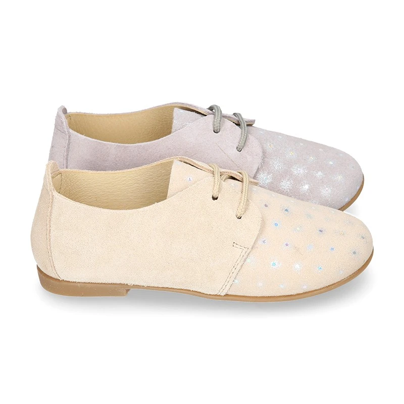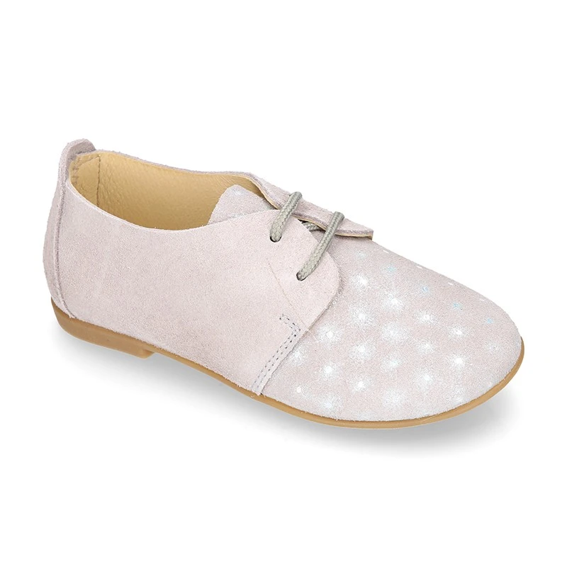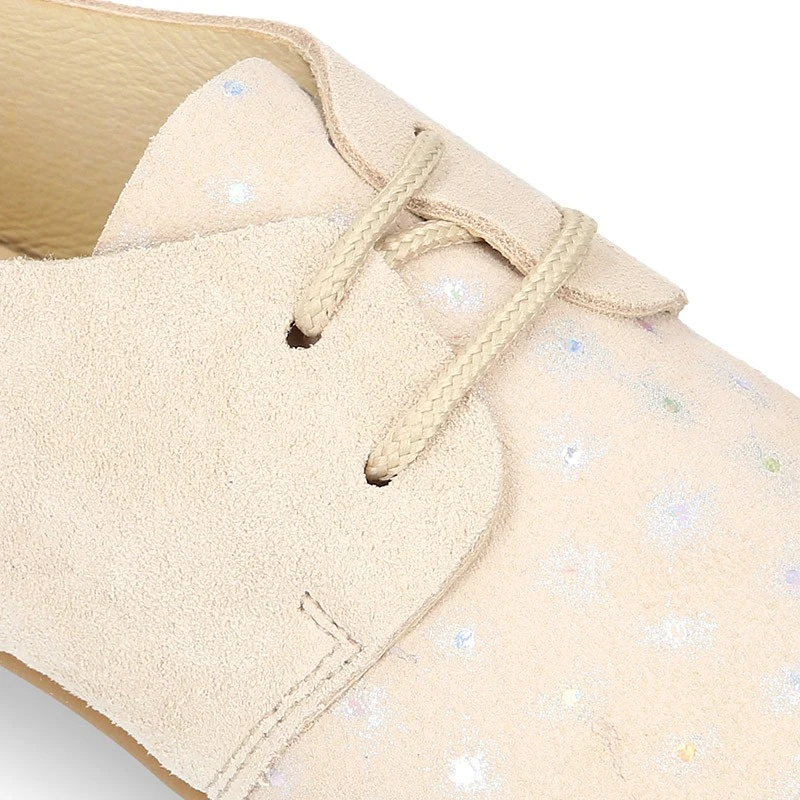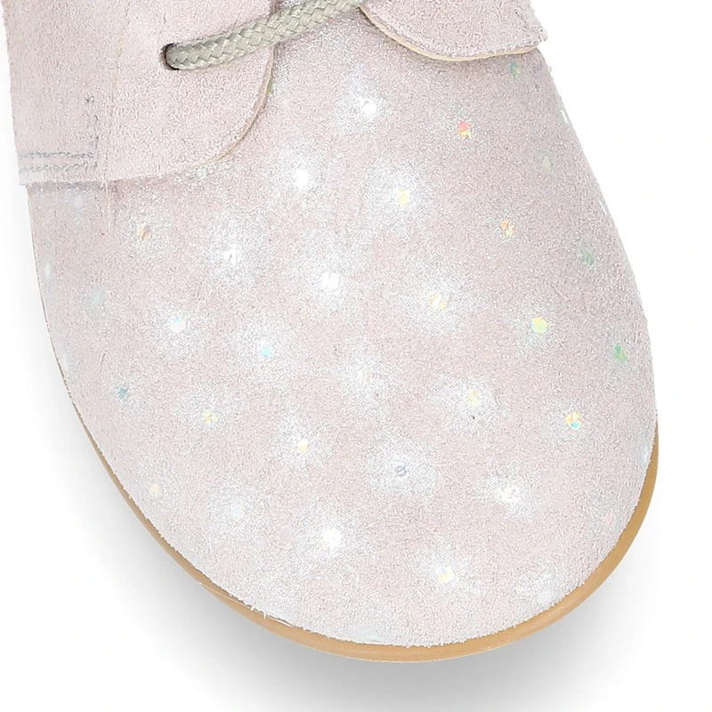 Zapatito tipo Blucher para primavera-verano con cordones en piel serraje combinada con destellos.